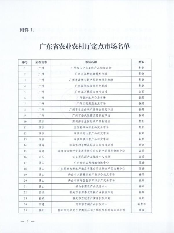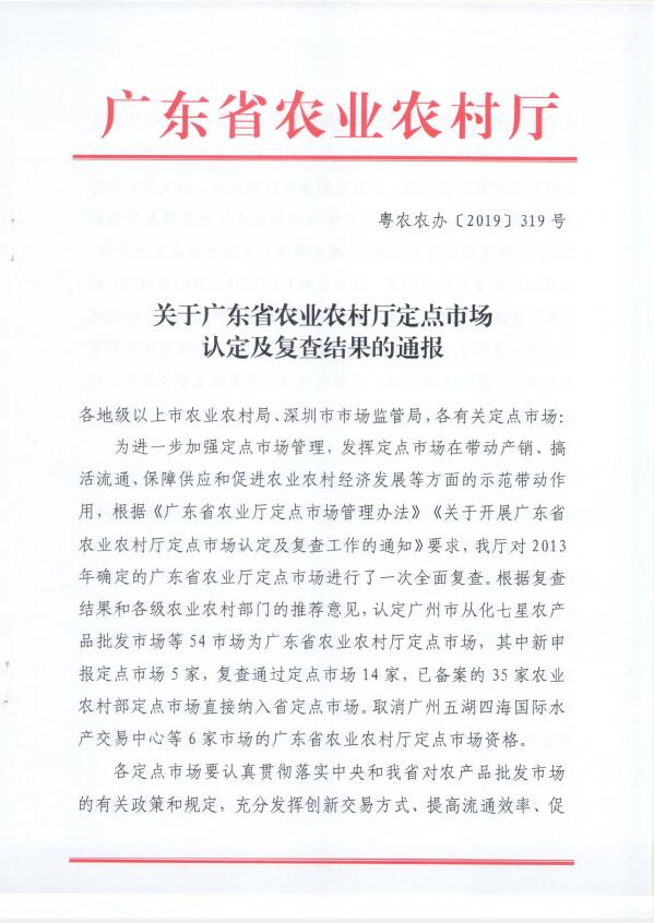 經(jīng)地市申報(bào)推薦、專家評(píng)審、實(shí)地考察、結(jié)果公示等程序,河源市農(nóng)副產(chǎn)品批發(fā)中心于2019年4月13日被認(rèn)定為省農(nóng)業(yè)農(nóng)村廳定點(diǎn)市場。